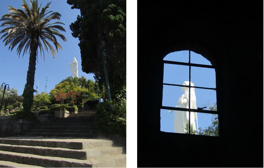 Mai sus, la capătul câtorva zeci de scări, zărim statuia albă a Mariei veghind asupra orașului. Un amfiteatru se întinde în fața ei, ca loc de rugăciune și meditație. Priveliștea din jur te lasă fără cuvinte, așa cum ne-am obișnuit. Lumea vine aici să se roage, să admire, să cânte, să se relaxeze sau pur și simplu să lase acolo jos, la baza dealului, orice grijă, neliniște sau tristețe și să plece de aici încărcat spiritual și liniștit.